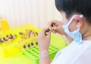 小さい豆の模型を掴んで、お箸トレーニングをします。